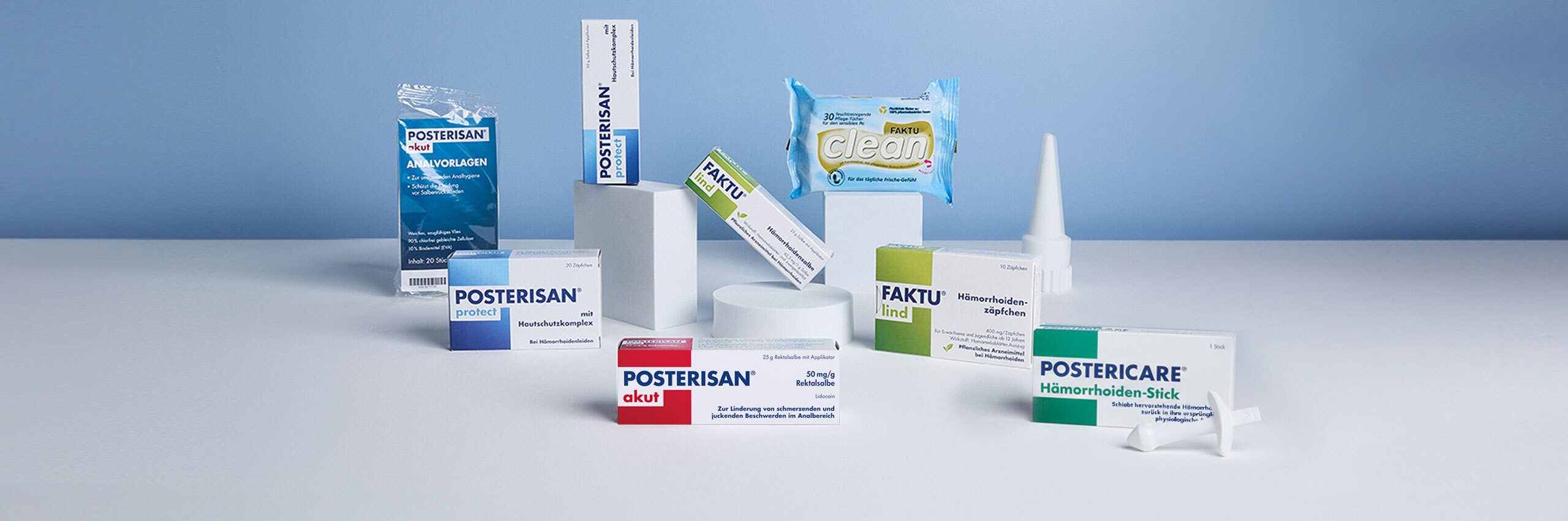 Posterisan® akut Salbe für den Tag, FAKTU® lind Hämorrhoidenzäpfchen für die Nacht. Das Duo für rundum spürbare Linderung.
